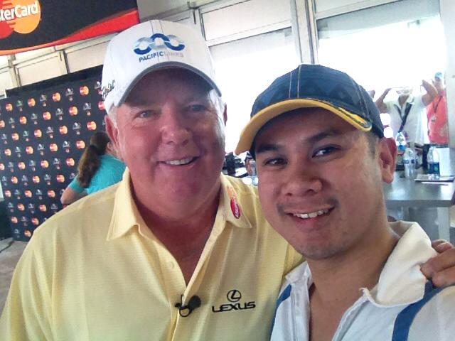 After the informal interview, World Golf Hall of Famers Curtis Strange and Mark O’Meara stood around while their film crew got a photo booth area ready for fans to take pictures with them. Naturally, they started chit-chatting with some of the fans and, before anyone knew what was happening, two lines were forming to take more casual cell phone picks with each of them. I ended up standing in the line for O’Meara.